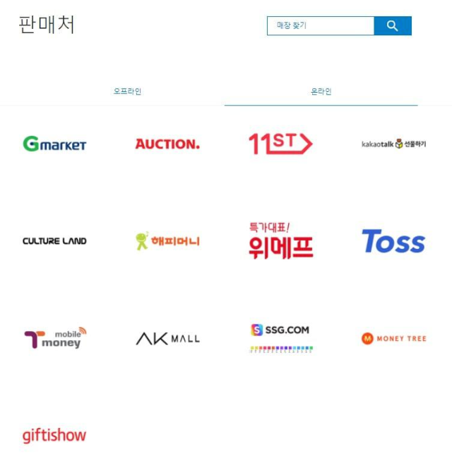 온라인 판매처는 G마켓, 옥션, 11번가, 카카오톡 선물하기, 컬쳐랜드, 해피머니, 위메프, 토스, 티머니, AK몰, SSG닷컴, 머니트리, 기프트쇼가 있습니다.